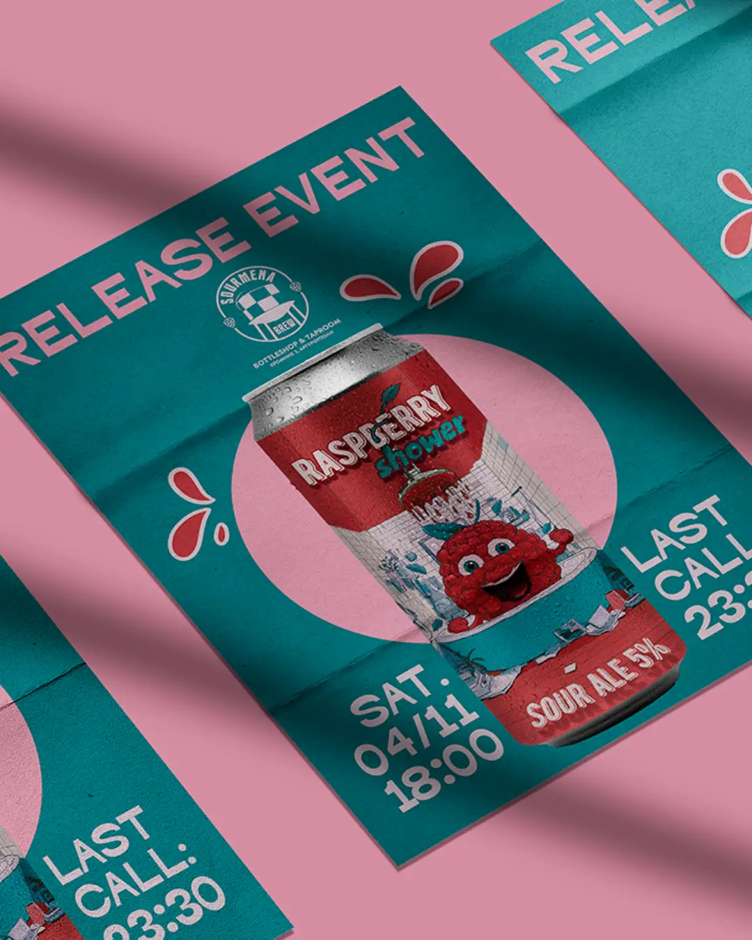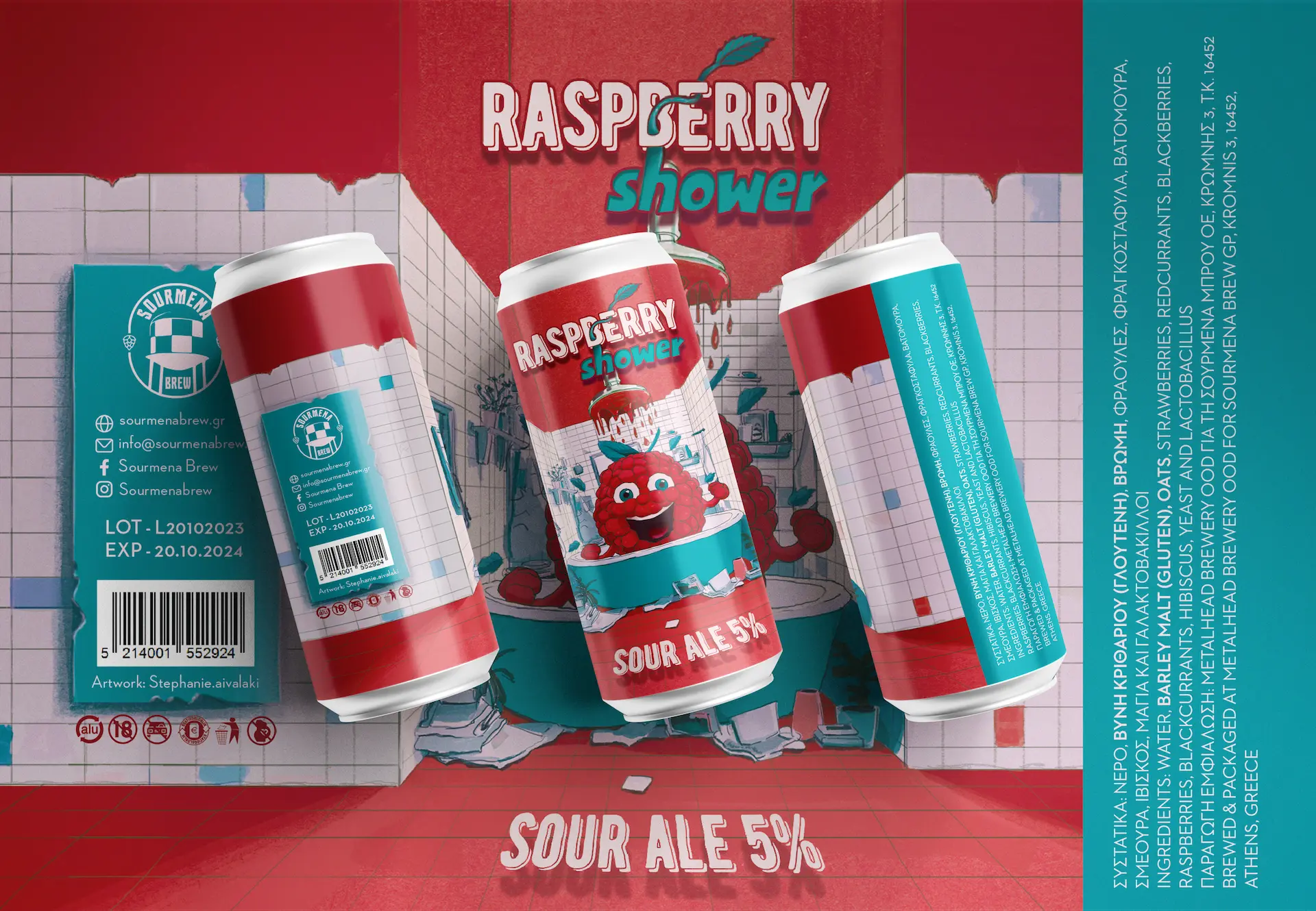 Designed for Sourmena Brew, Raspberry Shower is a standout sour beer crafted to capture the essence of summer. The can features a playful raspberry character enjoying a shower of juicy raspberry “rain,” perfectly reflecting the beer’s unique personality. This 500ml brew offers a light 5% ABV and a cider-like profile, bursting with fruity notes from raspberries, strawberries, and blackberries. Its bold red hue comes naturally from the fruit, with hibiscus added for a touch of floral complexity and extra vibrancy.